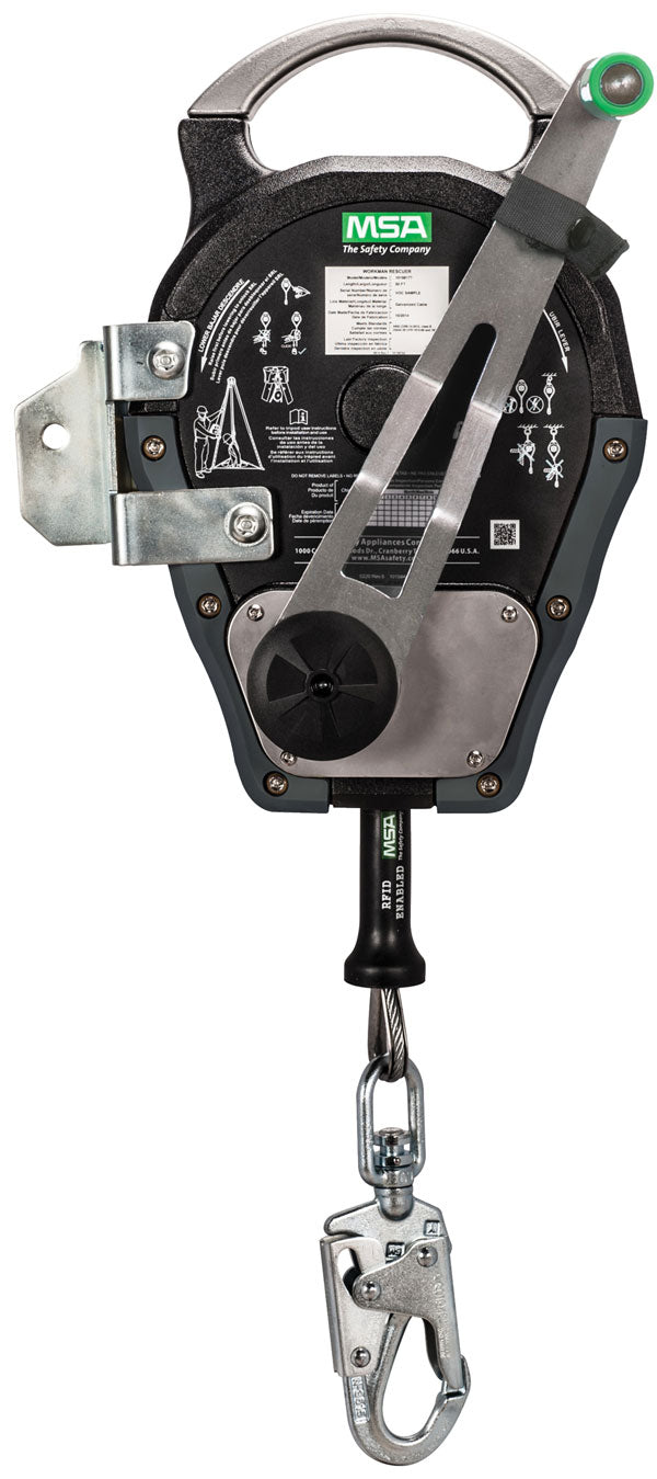 MSA’s Workman Rescuer provides fast, easy and intuitive fall protection with integral bi-directional retrieval capability. Not only does the Workman Rescuer arrest the fall, its retrieval capability allows the fallen worker to ascend or descend to a safe location. This durable, economical addition to the Workman Series of products offers fast installation and setup, ideal for applications where time and ease of use are a priority. The Workman Rescuer is also a stand-alone retractable device, as the carrying handle may be used as an anchorage attachment. Exclusive integral bracket uses existing tripod pin, leaving fewer components to attach, or become damaged or misplaced. Fall protection/retrieval mode knob simply pulls and rotates to activate. Use this device as a component of a confined space system for one application and as a standard self-retracting lanyard for another.